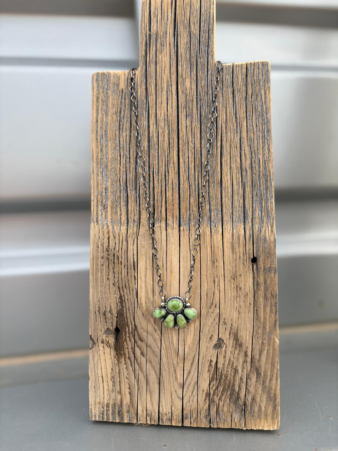 Carico Lake turquoise set in a sweet half cluster design, perfect for layering or wearing solo! It measures 19" long. The cluster measures 1 1/4" x 1". Stamped Travis J. and sterling.