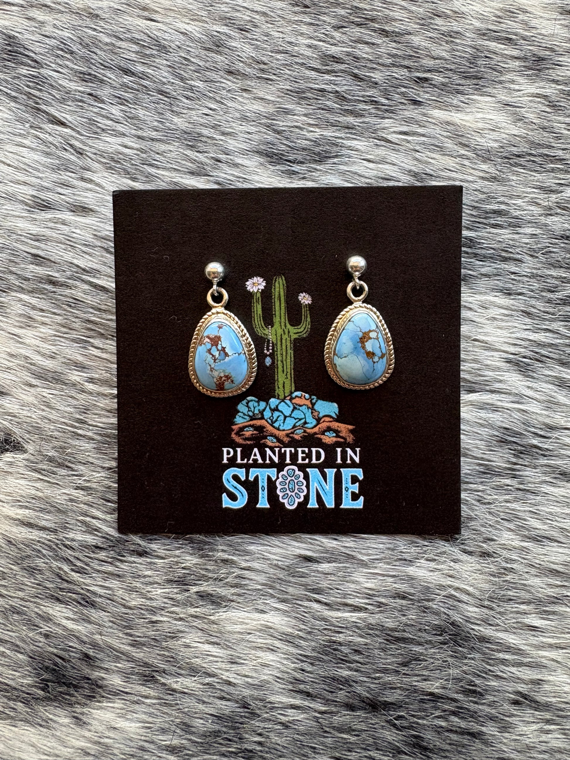 These earrings feature beautiful Golden Hills turquoise, celebrated for its soft periwinkle blue tones with rich brown matrix. Set in sterling silver with a delicate dangle design, they bring a touch of elegance and charm to any outfit! The measure 1” long. Stamped SH and sterling.