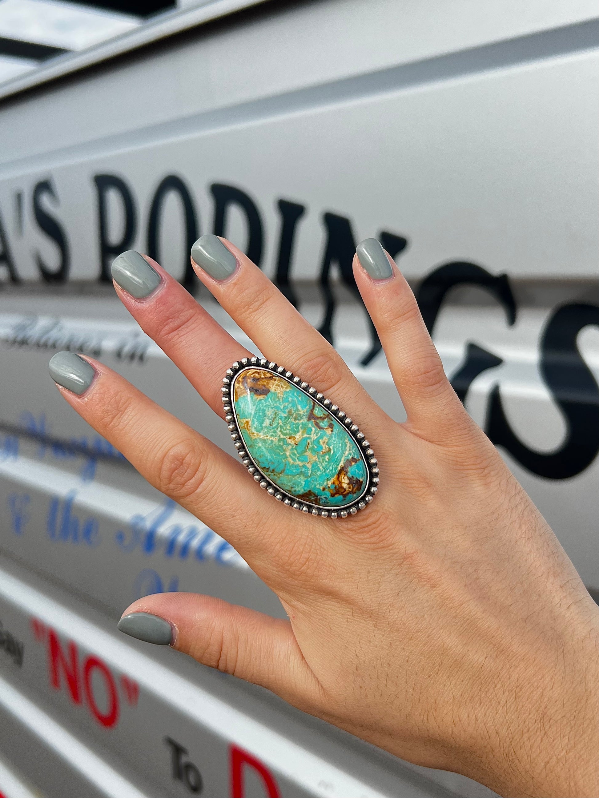 Big, bold, and one of a kind. This gorgeous Royston turquoise ring features dreamy blue-green swirls with rich golden matrix, all set in sterling silver with a comfy adjustable band. It’s giving desert queen energy!! 2” long. Stamped LRP and sterling.
