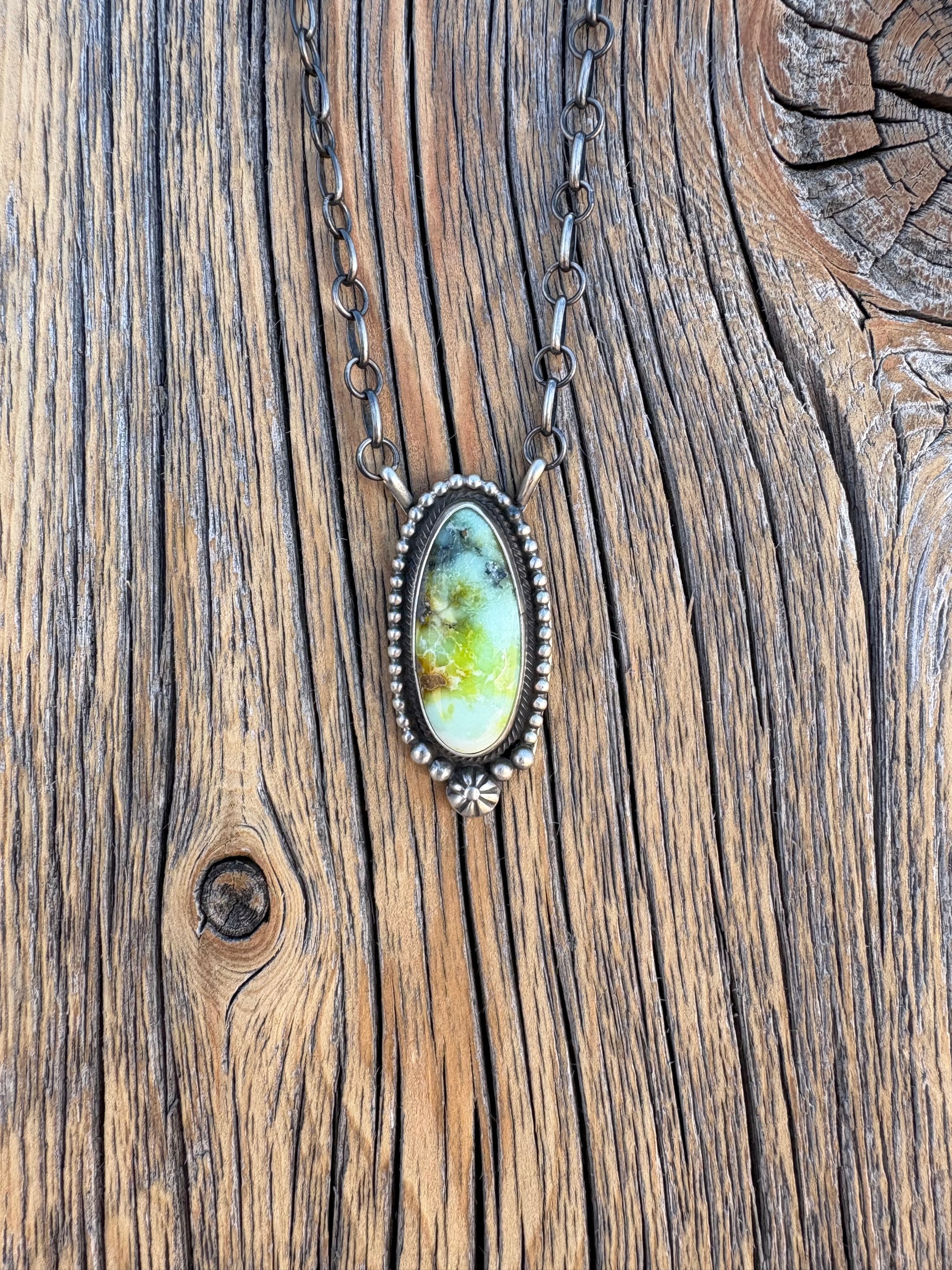 Palomino in rich green tones set in a sleek sterling silver vertical bar — a modern, minimalist piece with earthy elegance. Measures 19 1/2” long. The bar measures 1 3/4” long. Stamped by Eli Skeets.