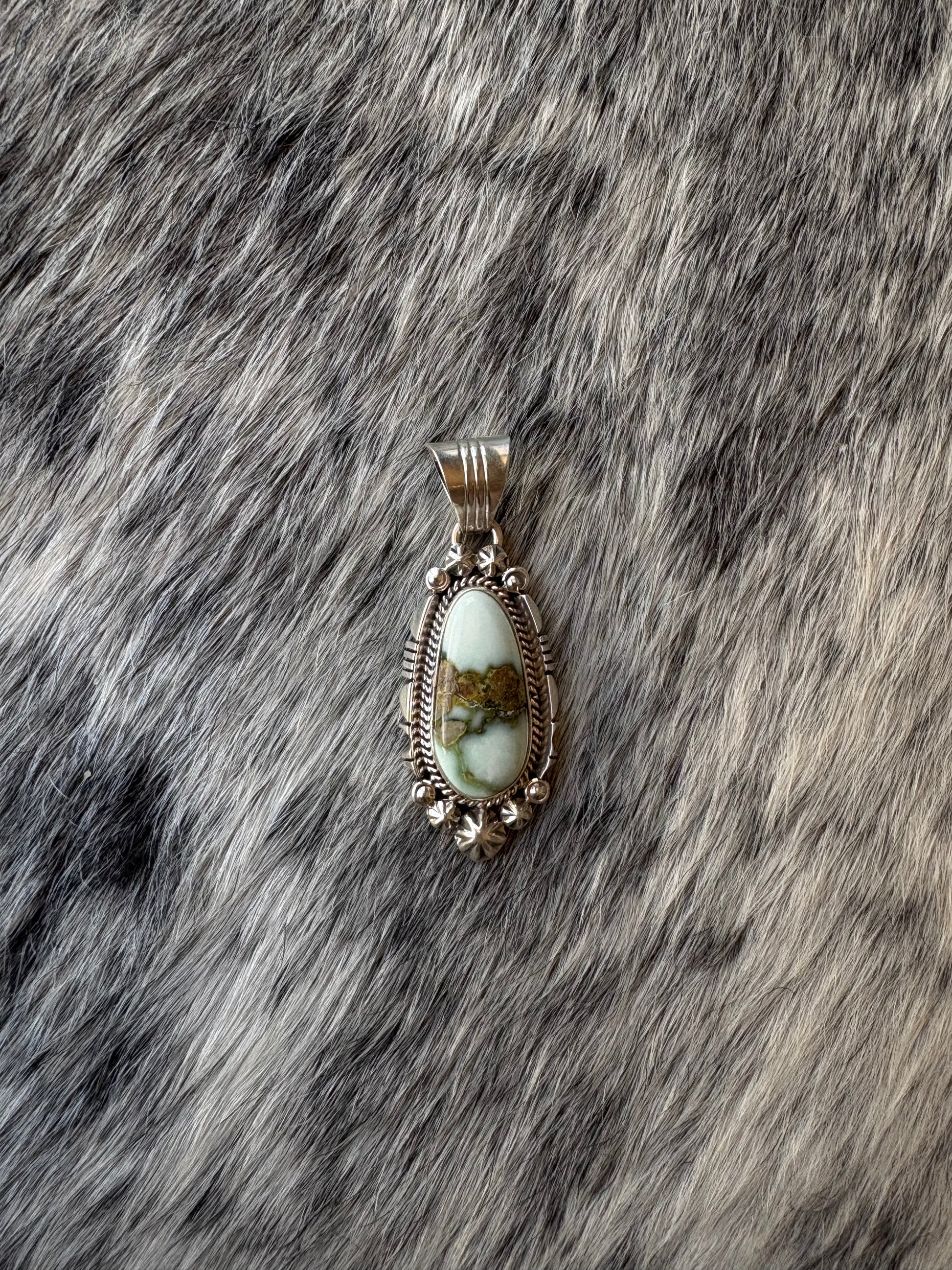 This pendant features a beautiful Palomino Variscite stone with soft green hues and earthy matrix, set in beautiful sterling silver! A unique, handcrafted piece showcasing the natural beauty of Palomino. Measures 2” long in total length. Fits up to a 6mm pearl. Made by navajo artist Daniel Benally.