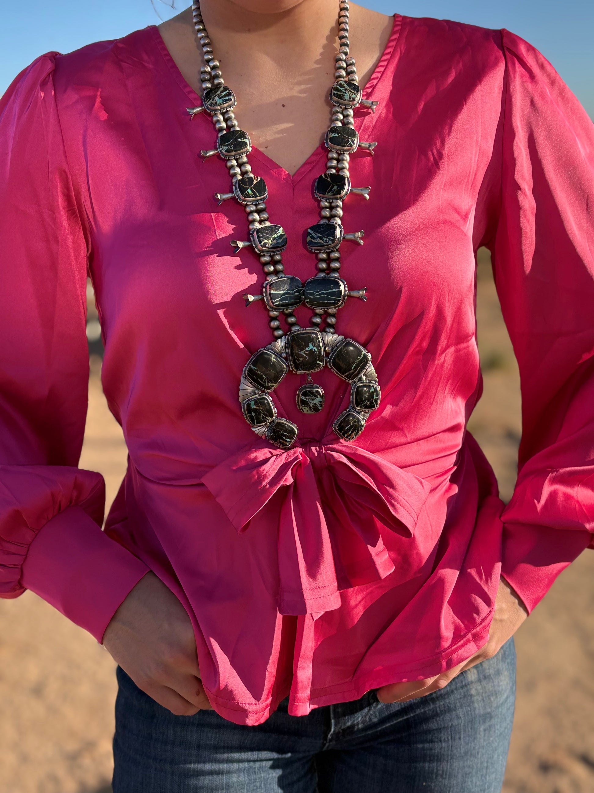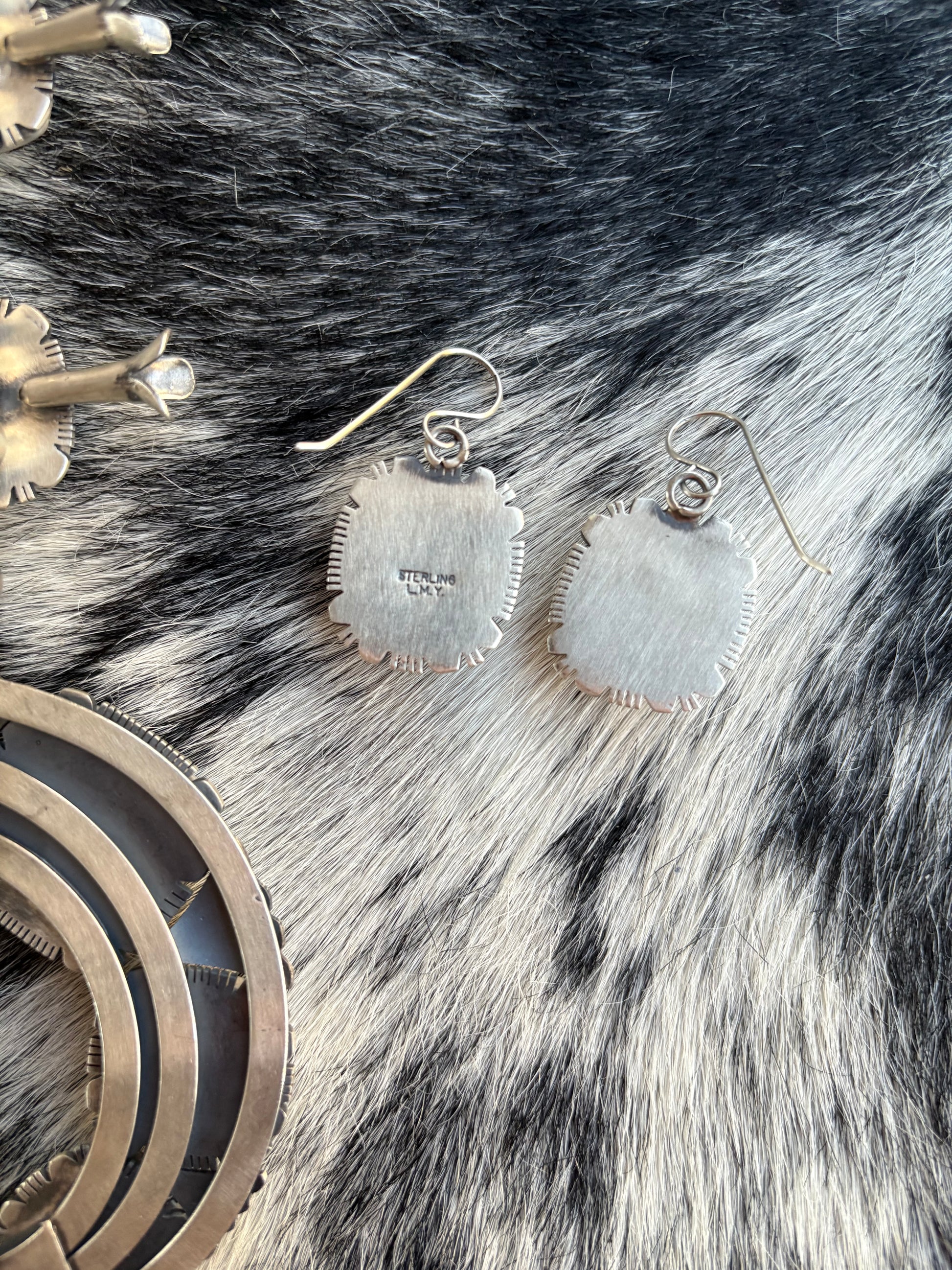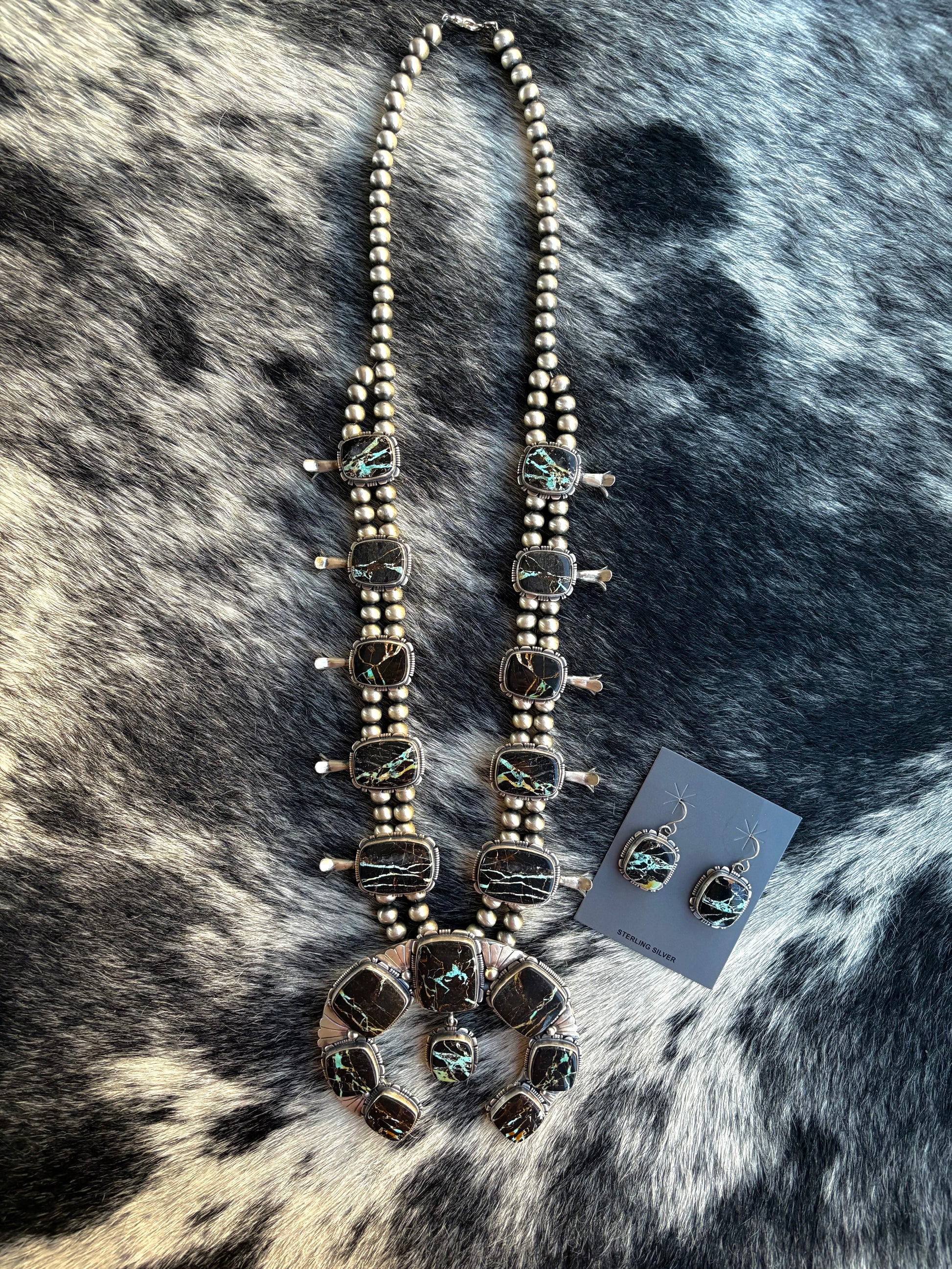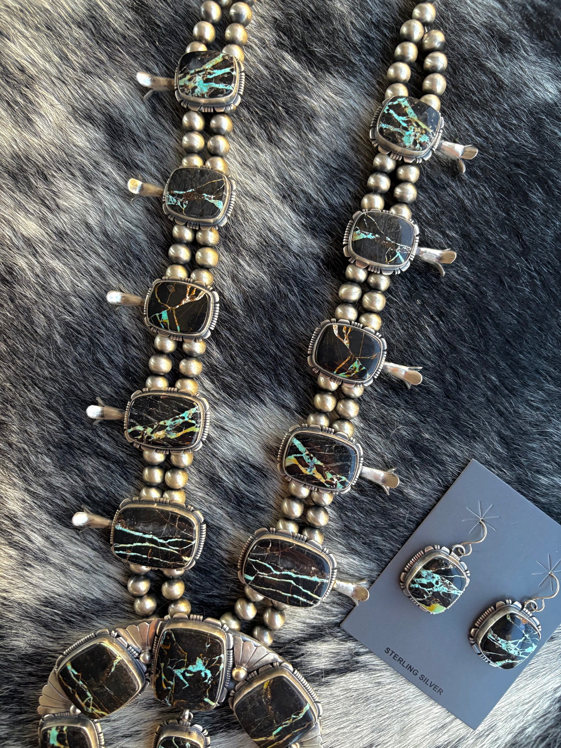 All eyes on you, girl! Made by Larry Yazzie, this beauty measures 29” with a 3 ½” drop and includes 1 ½” matching earrings. Weighs in at 279 grams.
